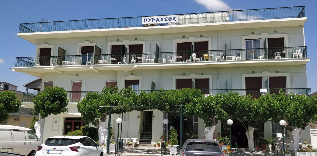 We usually stay at the Hotel Pyrassos. This is a small, family owned hotel with clean rooms, fresh linens and a wonderful breakfast to enjoy before your swim. We always try to stay the morning in order to get a swim at the wonderful beach where the water is warm and usually calm! This is a great picture from the Hotel website to show you were to go! Here is the link: http://hotelpyrassos.gr/